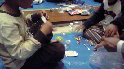 ボトルはゴミとせず、ちょっと工夫しておもちゃとして活用しましょう、ということで工作教室。