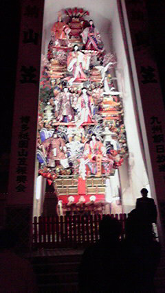 愉しく呑ませていただきまして、帰りはビルの入口までお見送りでお別れと思いきや、ママさん「良いモン見せてあげる」ってことでついて行くと、博多祇園山笠の、曳き山車の収納小屋へ連れて行ってくれました。