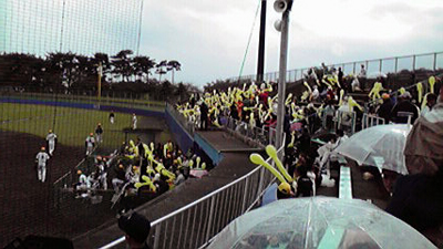 ファン感謝デーなので、ダッグアウトを前に出してお客さんもダッグアウトに入れるという粋な計らい。