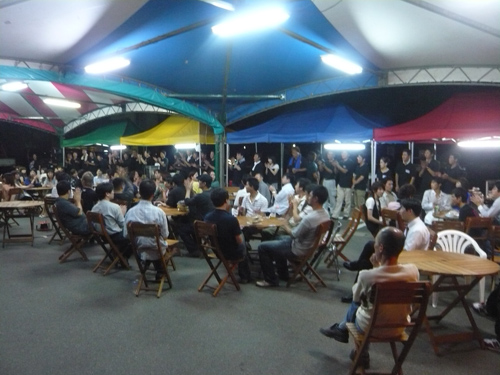 会場は、お祭り会場という設えで、部員が金魚すくいや、食べ物屋台を担当。