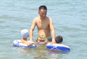 ここの海は、遠浅で結構沖合まで行っても、足が届くので、我が家みたいな小さな子どもがいる家族連れで大賑わいでした。